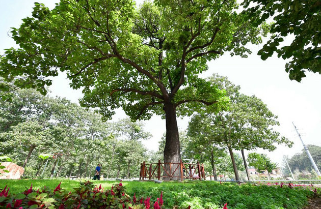 游客从兰考焦裕禄干部学院门口的“焦桐”下走过(2017年8月9日摄)。这棵泡桐是焦裕禄当年亲手种下,被人们称为“焦桐”。