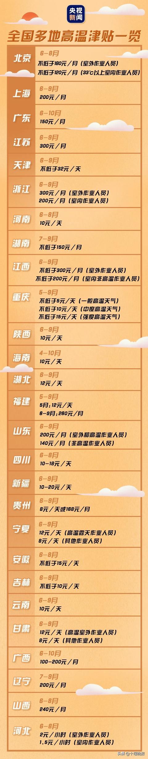 部分省份高温津贴发放标准如下:(上下滑动查看)