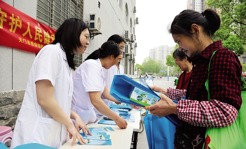 4月10日,在市疾控中心门前,市疾控中心血防所工作人员正在为群众宣讲血吸虫病防治知识,发放血吸虫病防治宣传手册等。该所以“消除血吸虫病危害,守护人民健康”为主题,于4月7日至13日开展血吸虫病防治宣传周活动,采取进乡镇、进社区、进学校等方式宣讲血吸虫病防治知识,宣传血防政策,展示防治成果,提高公众对血吸虫病的认知和防护意识。