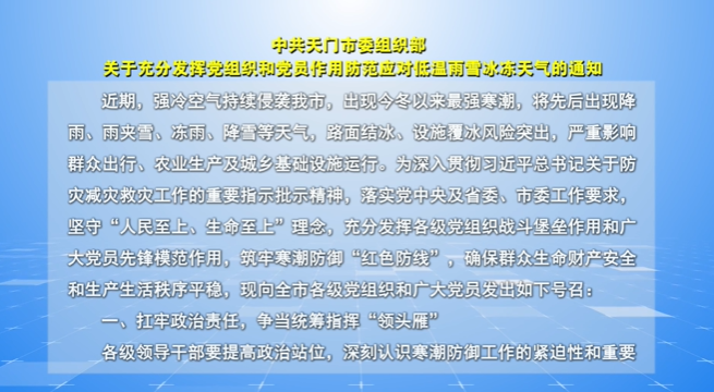 8、中共天门市委组织部关于充分发挥党组织和党员作用防范应对低温雨雪冰冻天气的通知