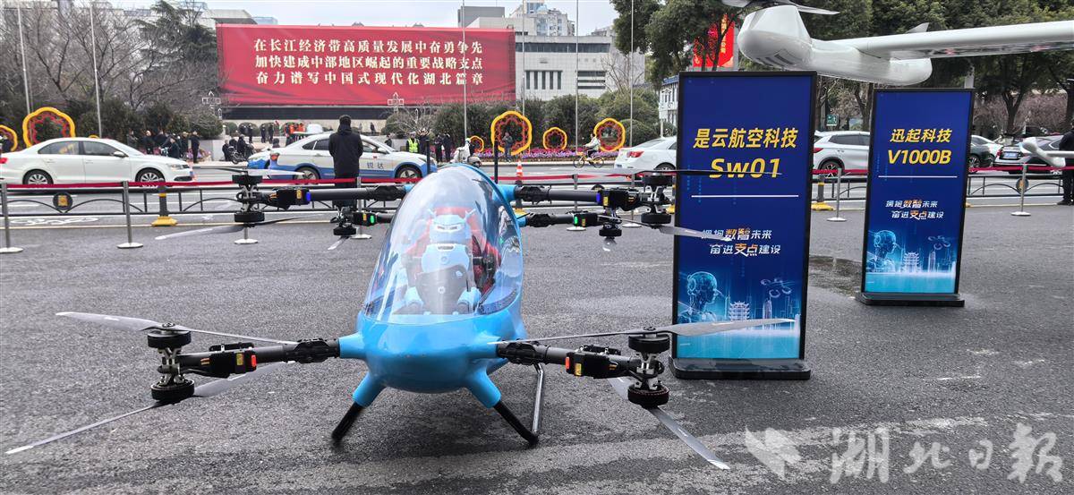 2月24日,春节后的首个工作日。武汉洪山礼堂门前,4款湖北造eVTOL(电动垂直起降飞行器)的集中展示,引来现场众人的关注。