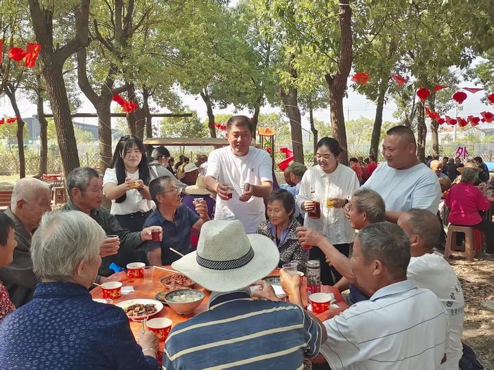 外岭村重阳节百叟宴上,吴劲松与村“两委”同事给老人送祝福。新华社发(外岭村供图)