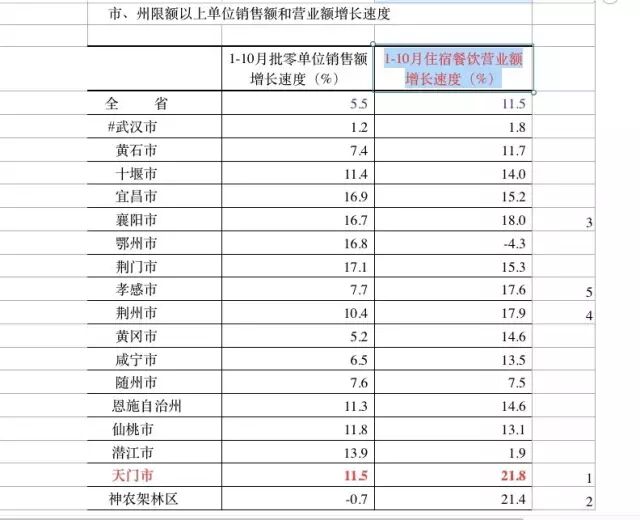 近日,湖北省统计局官网公布了1-10月全省统计数据。其中一项,亮瞎小编的双眼:天门住宿餐饮营业额增长速度全省第一!