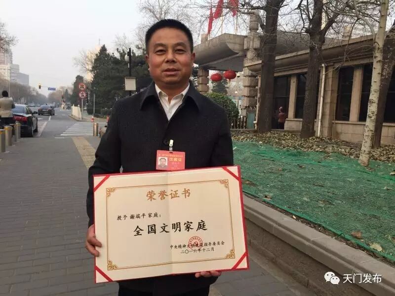 12日,第一届全国文明家庭表彰大会在京举行,天门谢端平家庭被评为“全国文明家庭”,并受到中共中央总书记、国家主席、中央军委主席习近平的亲切会见。