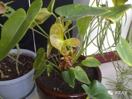 红掌缺水的状态下,底部的叶片会出现发黄情况,这时就要及时补充水分,红掌浇水一般是不干不浇,摸到盆土干了再浇水,冬天温度低少浇水。