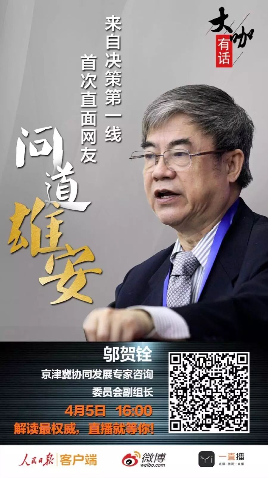 今天下午4点,京津冀协同发展专家委员会副组长、中国工程院院士邬贺铨将做客人民日报客户端《大咖有话》栏目,为我们带来关于雄安新区的权威解读,并回答网友提问。