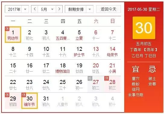2017年端午节是5月30日,农历五月初五,星期二。根据《国务院办公厅关于2017年部分节假日安排的通知》,2017年端午节放假安排如下: