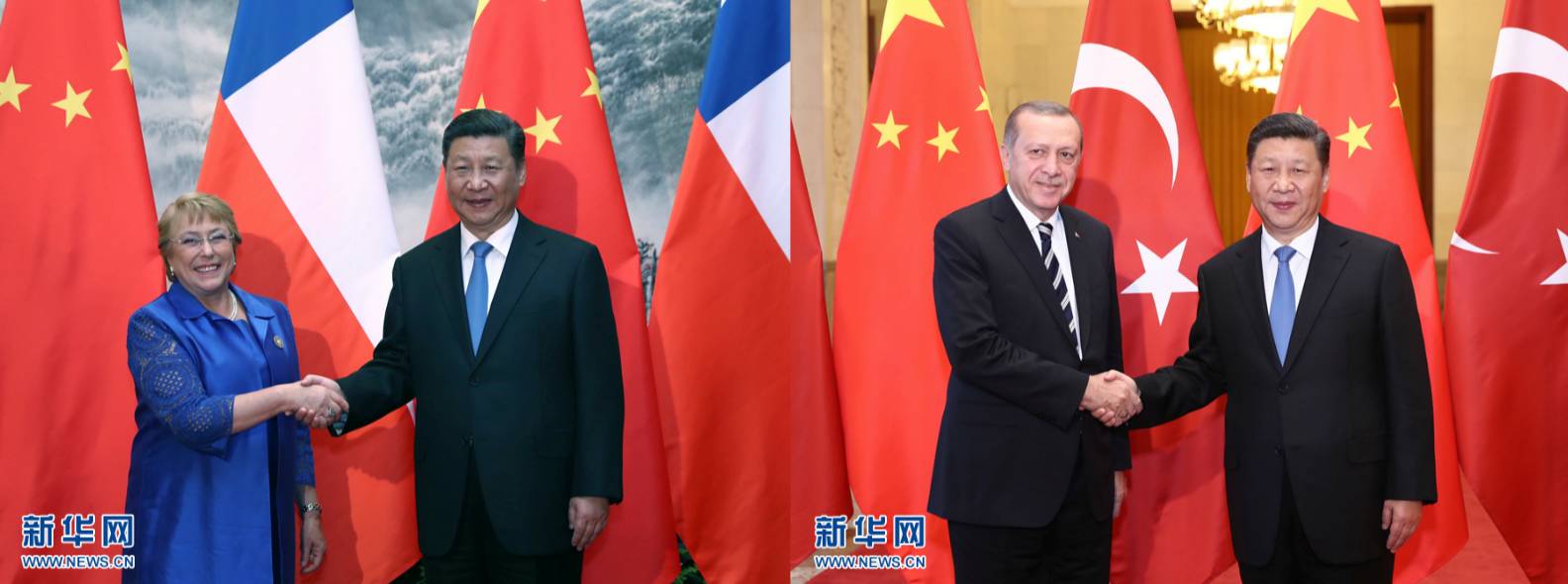 国家主席习近平13日分别举行仪式欢迎智利总统巴切莱特、土耳其总统埃尔多安访华,并同他们举行会谈。