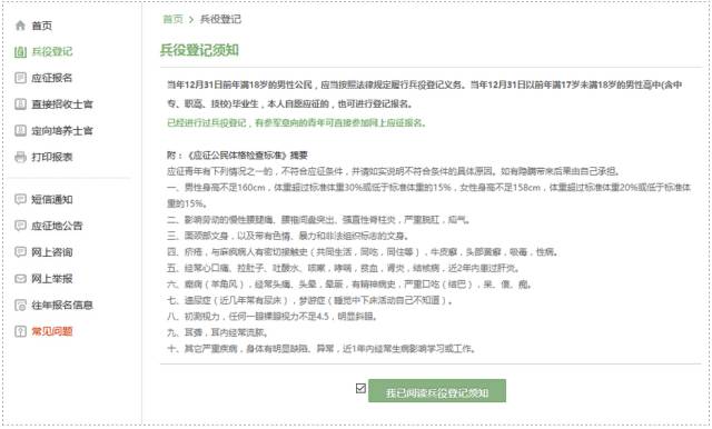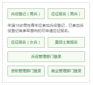 有些小伙伴看到这么多的菜单就有些懵了,其实不用紧张,如果你是第一次来的男生,直接从“兵役登记(男兵)”进入页面就可以了;否则就从“应征报名(男兵)”进入页面;如果想报名直招士官,就从“直招士官报名”进入页面。