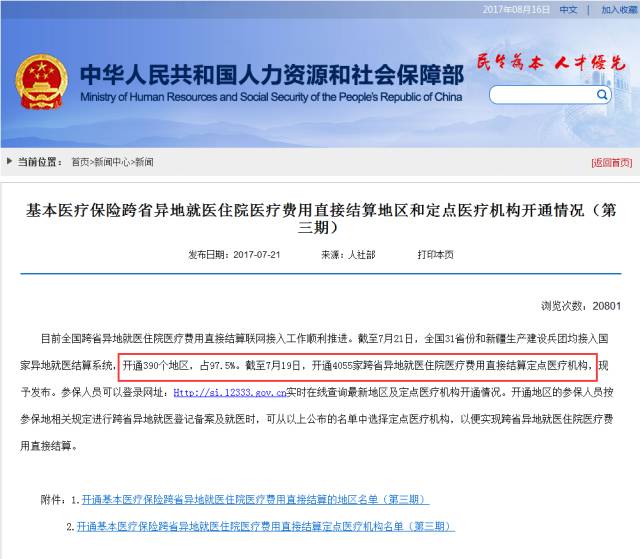 7月21日,人社部公布了基本医疗保险跨省异地就医住院医疗费用直接结算地区和定点医疗机构开通情况。截至7月底,全国393个地区已开通国家异地就医结算系统,覆盖全国98%地区,5102家定点医疗机构开通跨省异地就医住院医疗费用直接结算。