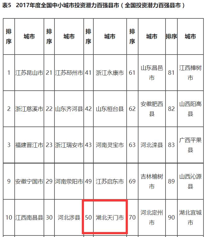 9日,《人民日报》发布了2017年度中国中小城市科学发展指数研究成果,公布了关于2017年度全国中小城市投资潜力百强县市等榜单,天门再度入围“全国中小城市投资潜力百强县市”,位居第50位。
