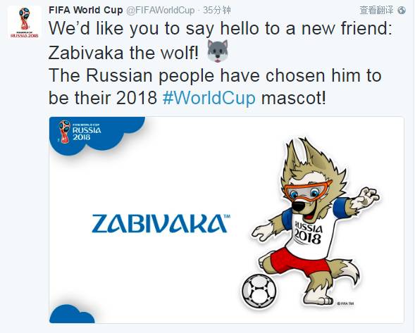 当地时间21日晚,名为扎比瓦卡的卡通造型“狼”在俄罗斯全民投票环节中胜出,成为2018年俄罗斯世界杯官方吉祥物。